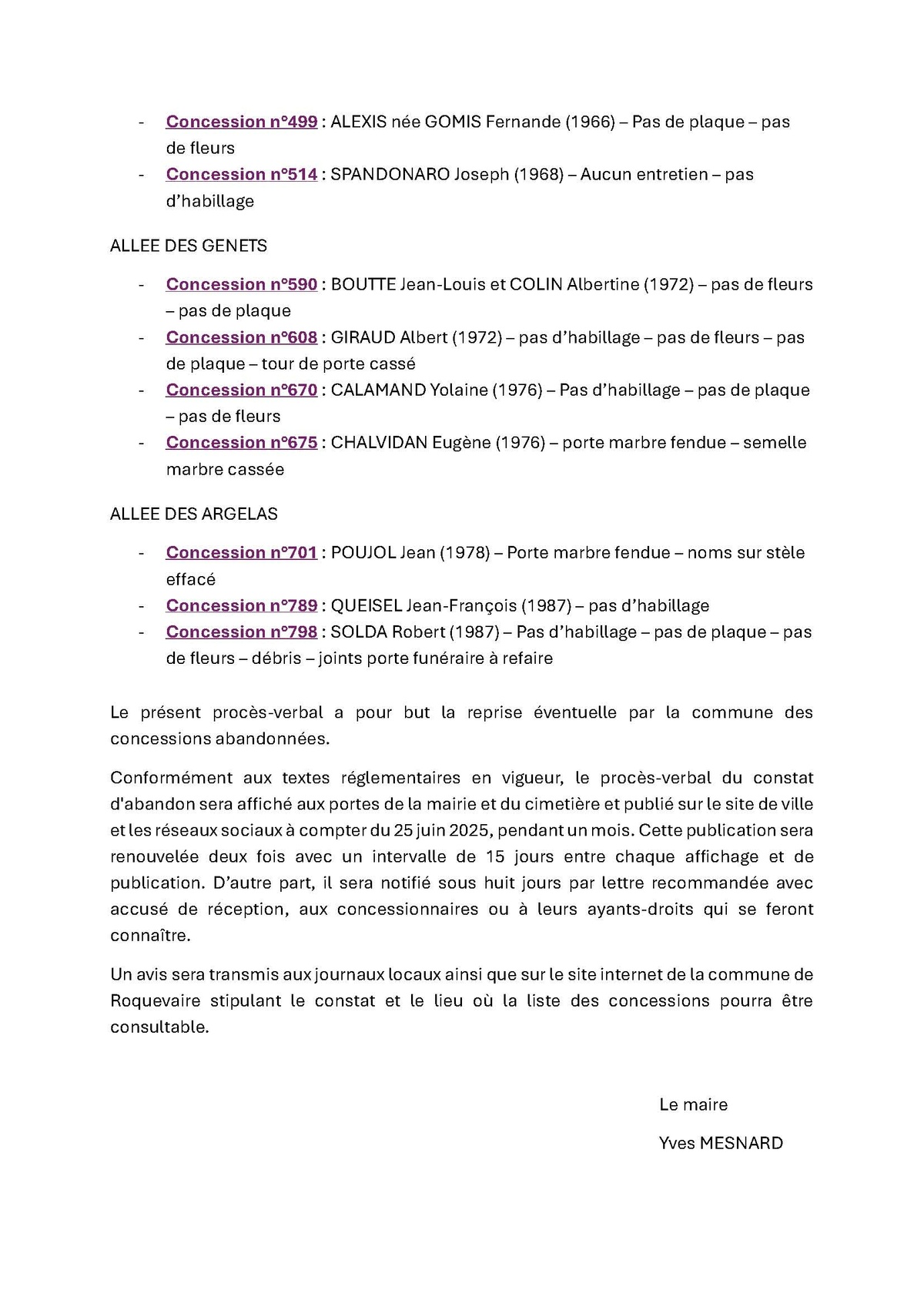 Si vous êtes concessionnaire ou ayant droit d’une des concessions mentionnées dans le procès-verbal, nous vous invitons à vous faire connaître auprès du service cimetière de la mairie de Roquevaire dans les meilleurs délais.