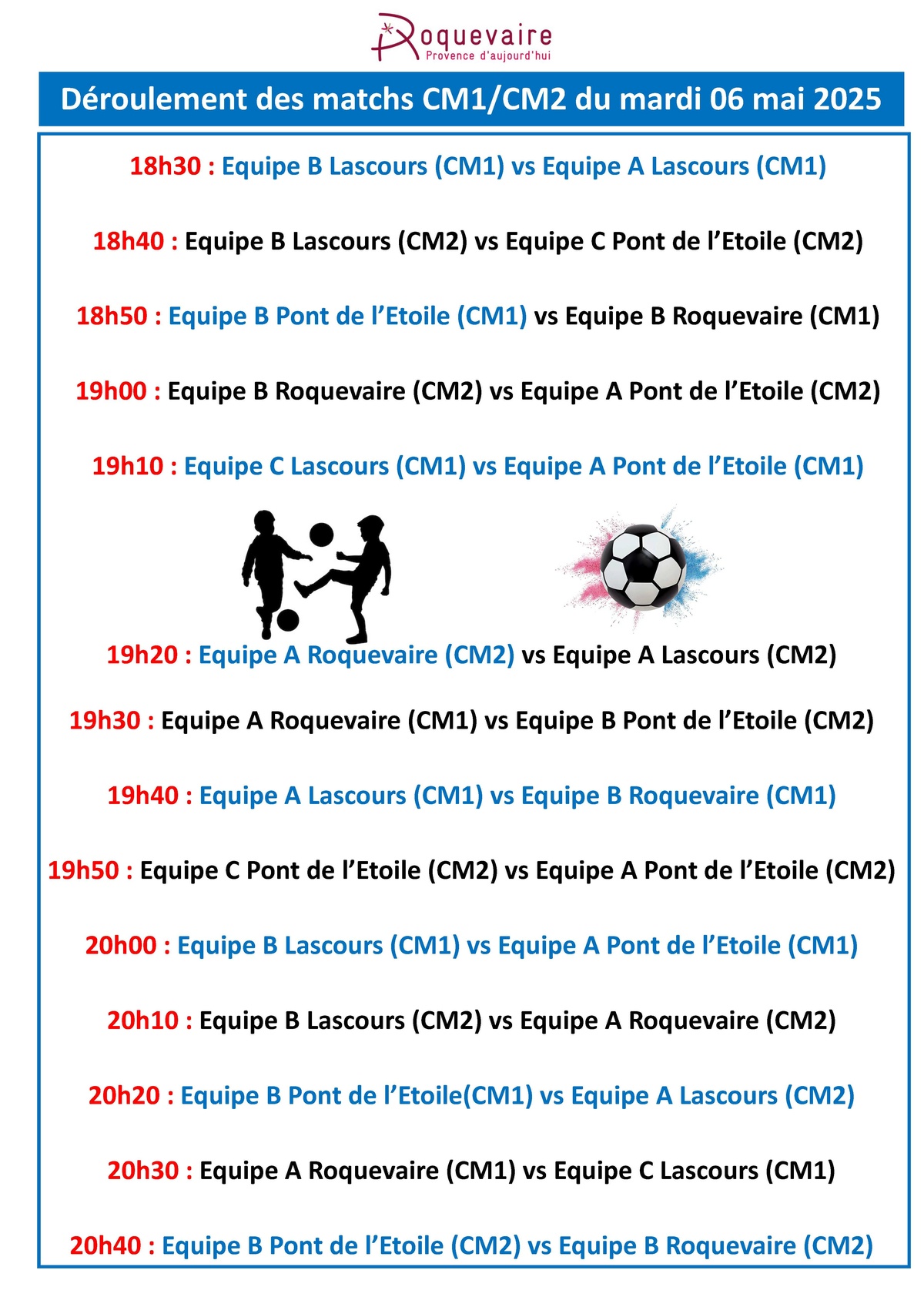 ⚽️ Voici le déroulement des matchs des CM1/CM2 du mardi 6 mai 2025 et des CE1/CE2 du mardi 13 mai 2025 au City Park de Pont de l'Etoile.