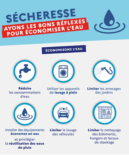 Notre commune est en vigilance sécheresse. Aucune mesure de restriction ne s’applique mais les usagers sont invités à une plus grande sobriété des utilisations de l’eau.