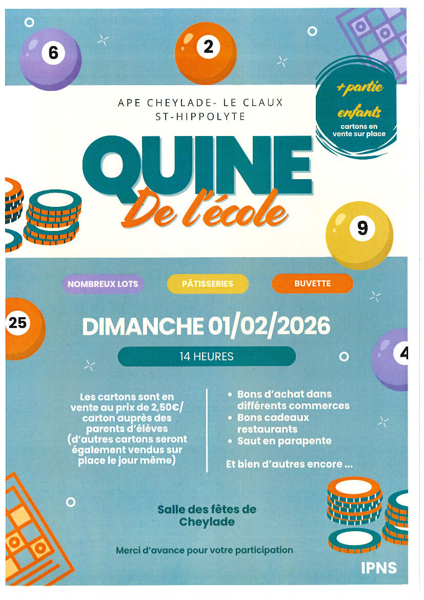 QUINE - LOTO de l'Ecole le 1er FEVRIER 2026