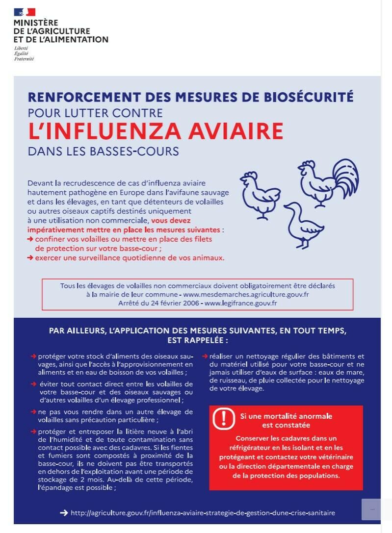 ⚠ Risque élevé d'influenza aviaire dans les basses cours ⚠