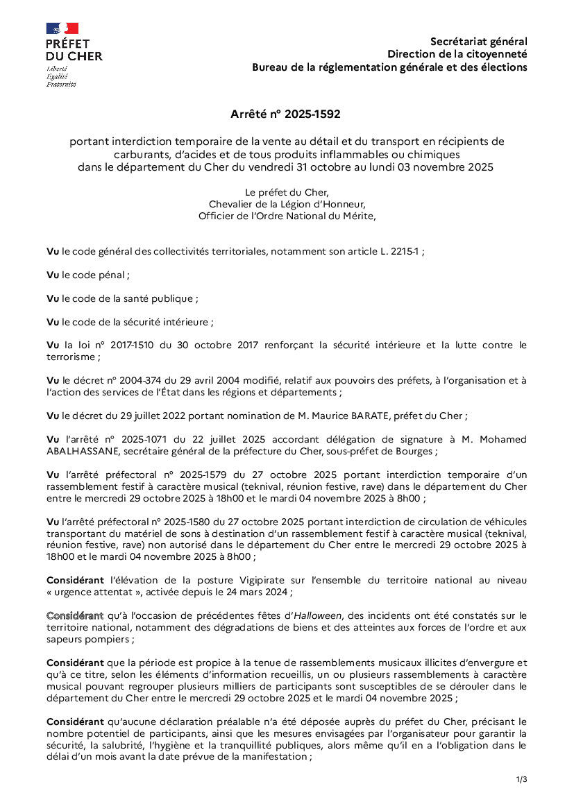 Arrêtés préfectoraux applicables du 31/10 à 8h au 03/11 à 8h
