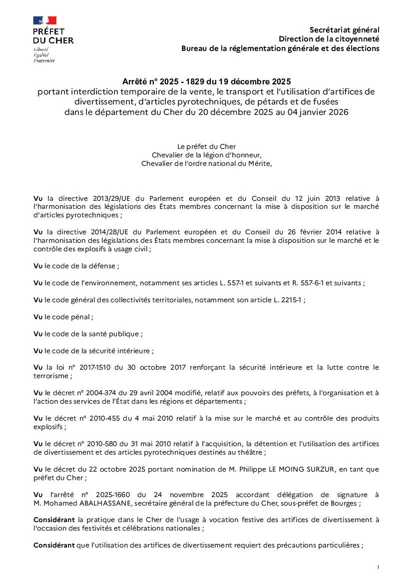 Dans le département du Cher du 20 décembre 2025 au 04 janvier 2026 interdiction temporaire: