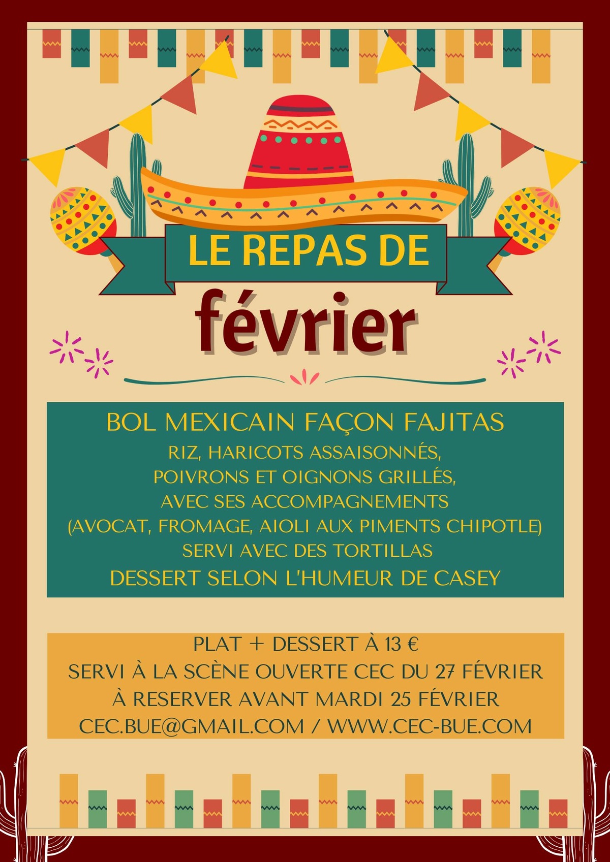 Repas maison : Bol Mexicain façon Fajitas (riz, haricots assaisonnés, poivrons et oignons grillés) avec ses accompagnements (Avocat, fromage, aïoli aux piments chipotle) servi avec ses tortillas, et dessert maison selon l'humeur de Casey. 13€, réserver avant le mardi 25, par e-mail ou sur le site. Servi à partir de 20h.