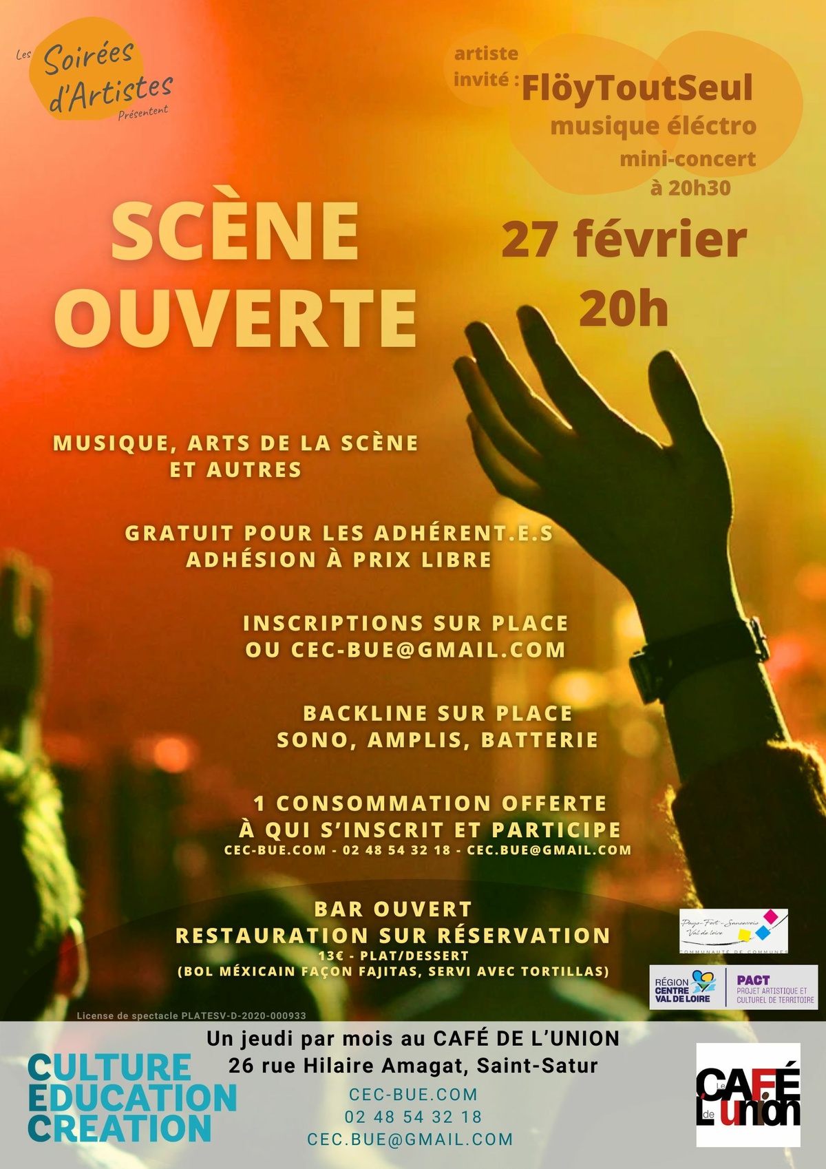 À partir de 20h au Café de l'Union, 26 rue Amagat, Saint-Satur (18). Mini-spectacle à 20h30, Scène Ouverte à 21h.