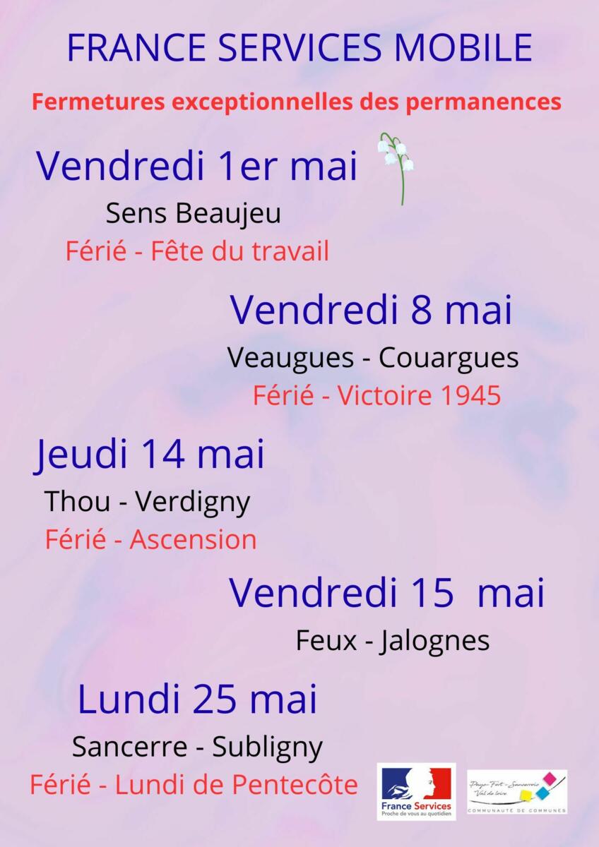 Les beaux jours arrivent et quelques dates de permanences France services Mobile seront fermées car c'est FÉRIÉ !