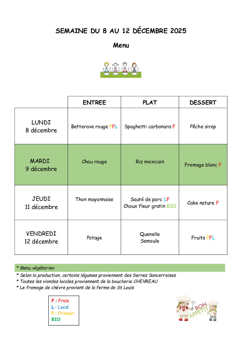 Menu du 08 au 12 décembre 2025