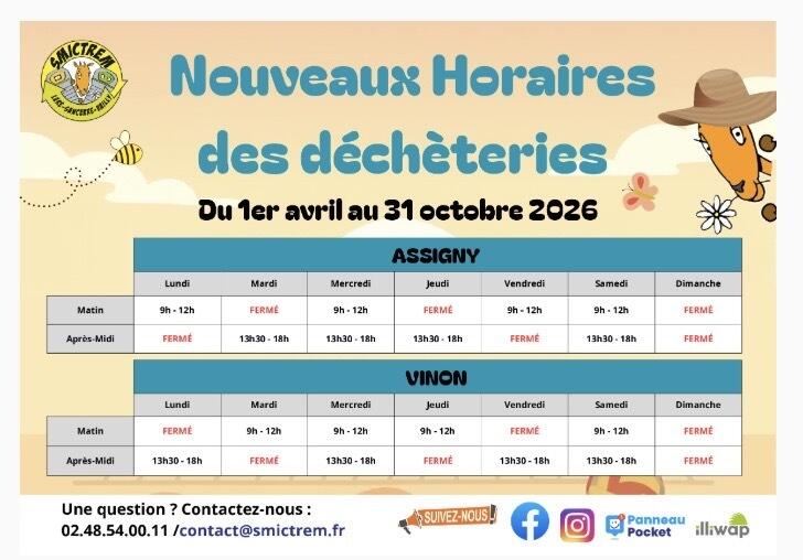 Déchèterie de Vinon : horaires d'Eté 7/4/26 Depuis le 1er avril , passage aux horaires d'Eté de la déchèterie! Source : Mairie de Verdigny