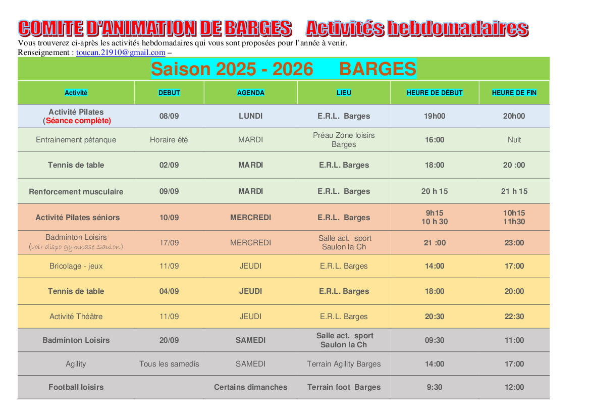 Voici le récapitulatif des activités hebdomadaires proposées par le COMITE D'ANIMATION de septembre 2025 à juin 2026.