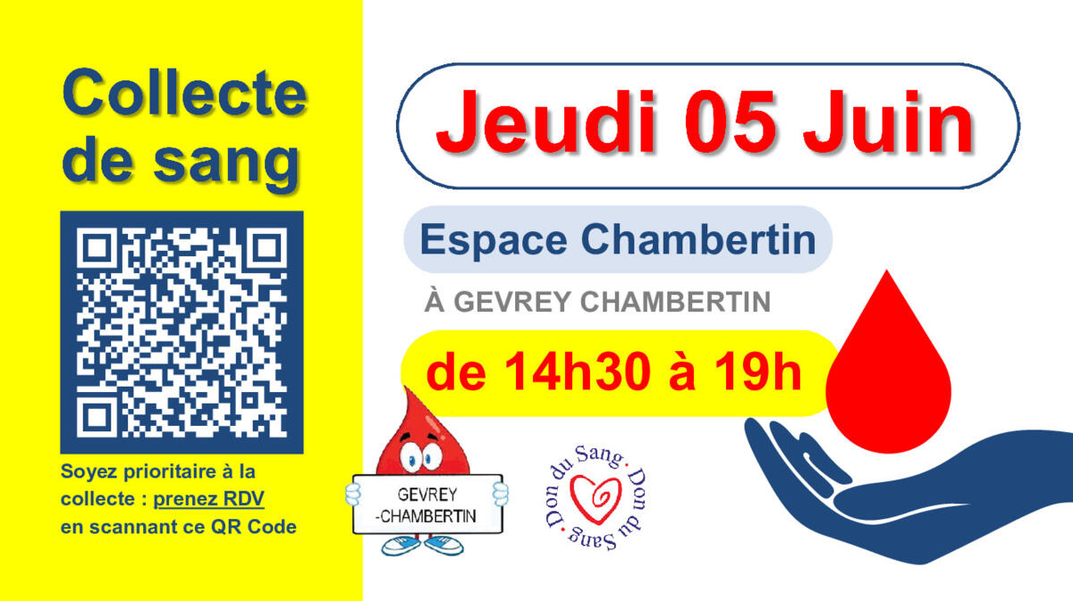 Collecte de sang 28/5/25 Donnez votre sang Jeudi 5 juin Espace Chambertin à Gevrey-Chambertin De 14h30 à 19h