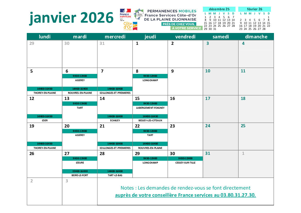 Vous trouverez ci-joint le planning des permanenciers de la France services Côte d’Or de la Plaine Dijonnaise pour le mois de janvier 2026.