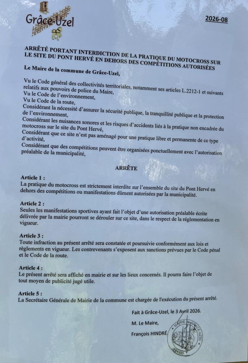 Un arrêté du 3 avril 2026 a été pris et des pancartes ont été affichées sur place.