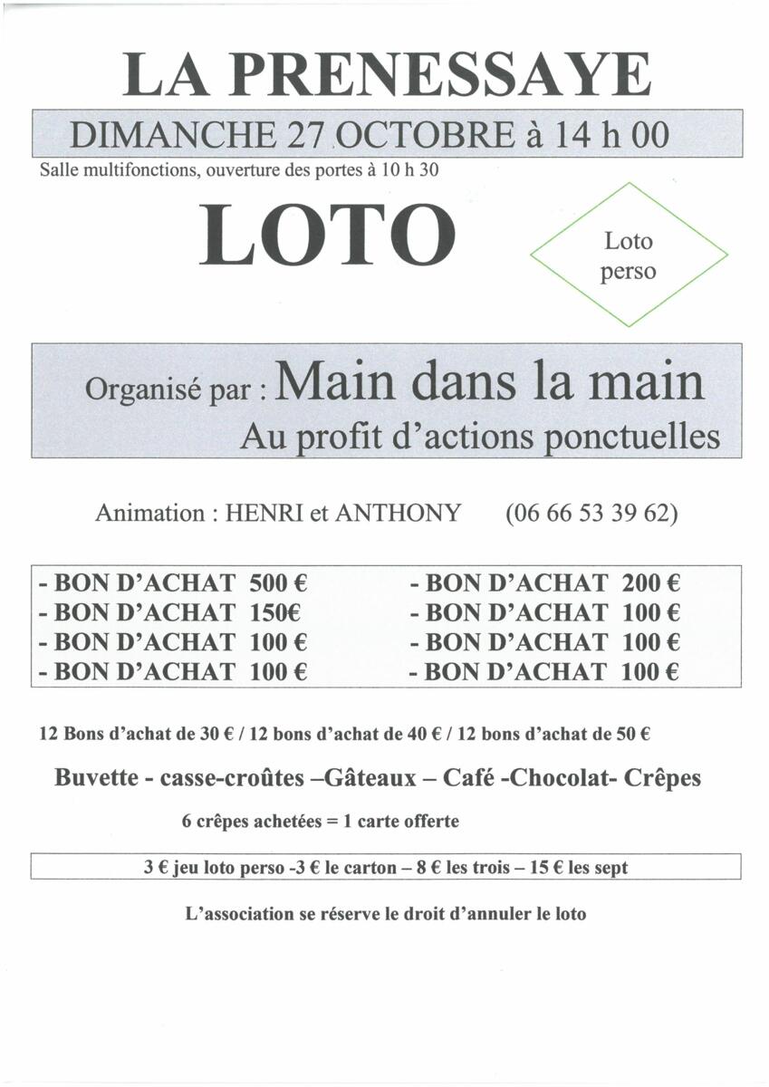 L’association Main dans la main organise dimanche 27 octobre un loto à la salle multifonctions à partir de 14h .