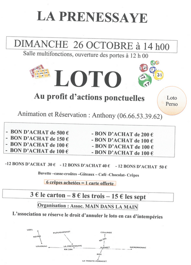 L’association Main dans la main organise dimanche 26 octobre un loto à la salle multifonctions à partir de 14h .