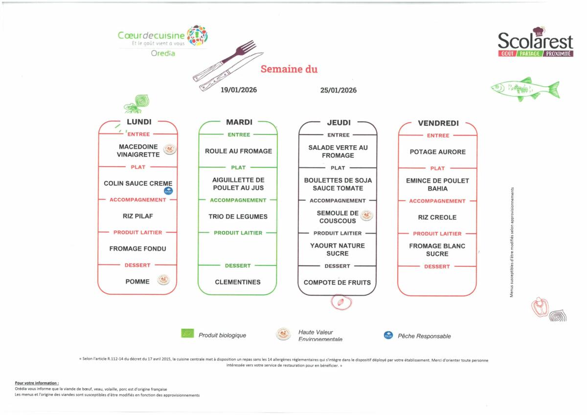 Veuillez trouver ci-dessous les menus du 19 au 23 janvier 2026