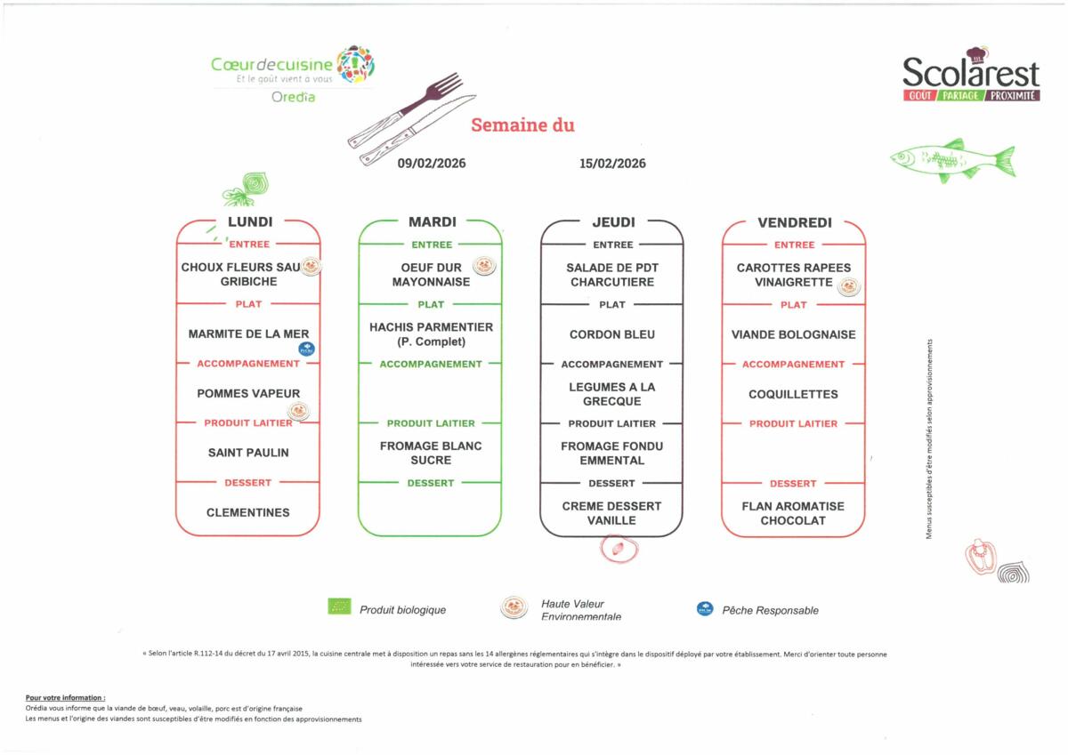 Veuillez trouver ci-dessous les menus du 9 au 13 février 2026