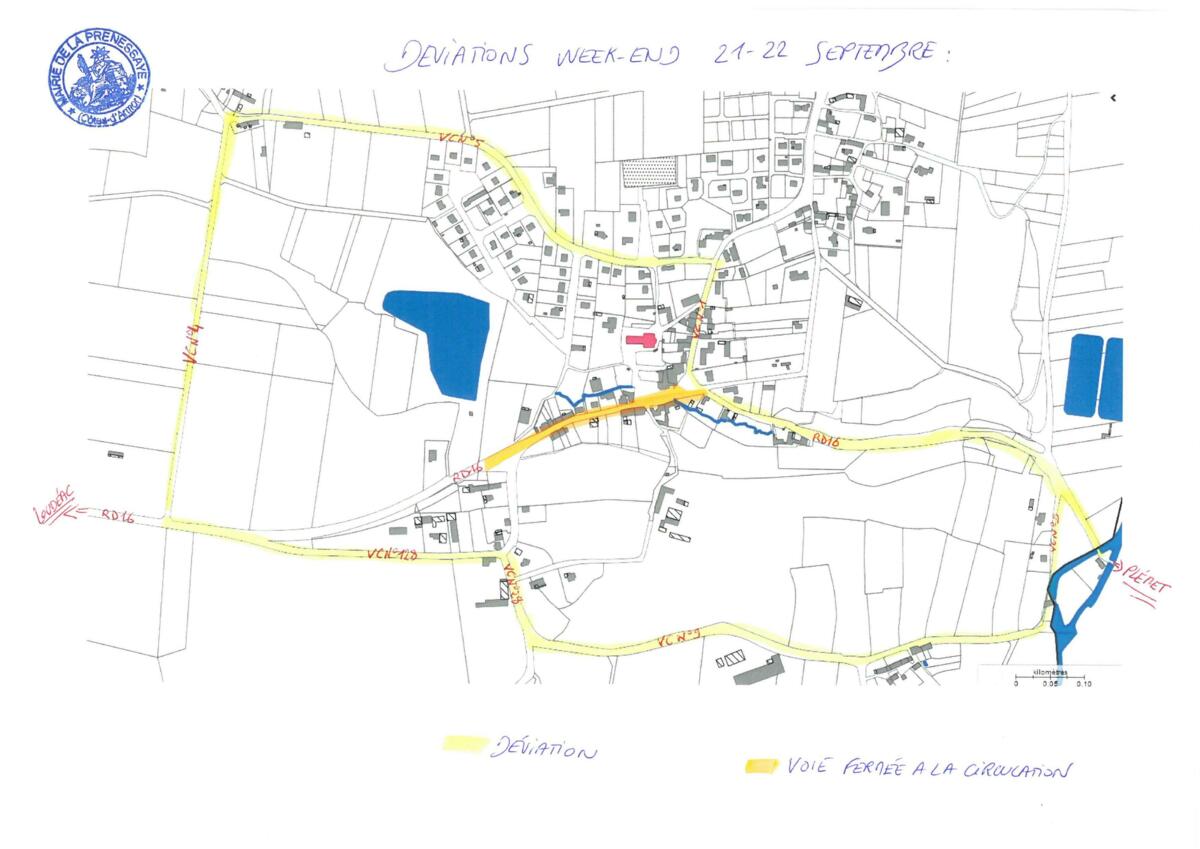 Une déviation sera mise en place par les voies communales en venant de : Loudéac vers Plémet : N°4 ; N°5 ; N°1, et RD16ou Plémet vers Loudéac : N°9, N°28 ; N°128 et la RD 16.