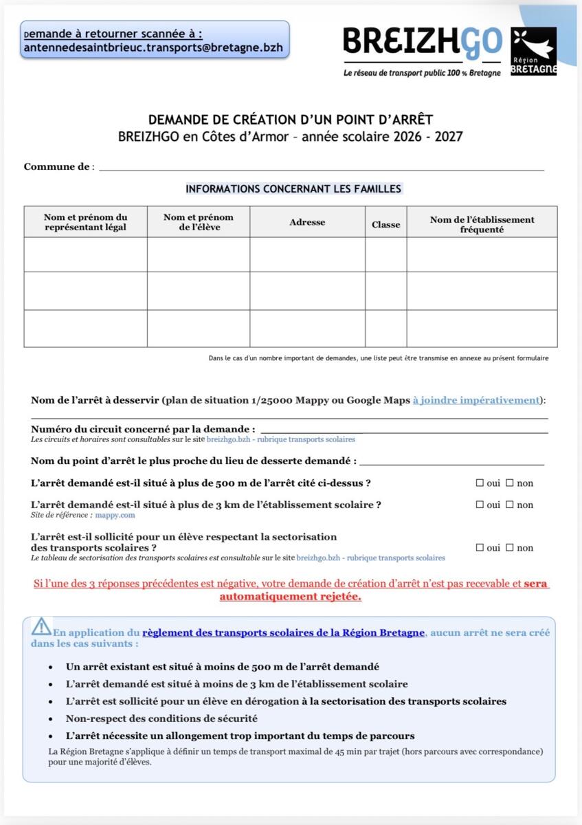 Nous vous prions de bien vouloir trouver ci-joint le formulaire de demande de création de point d'arrêt pour l'année scolaire 2026 - 2027, sur les services scolaires BreizhGo desservant votre commune, ainsi qu'un courrier d'accompagnement et le passeport sécurité transmis aux usagers.