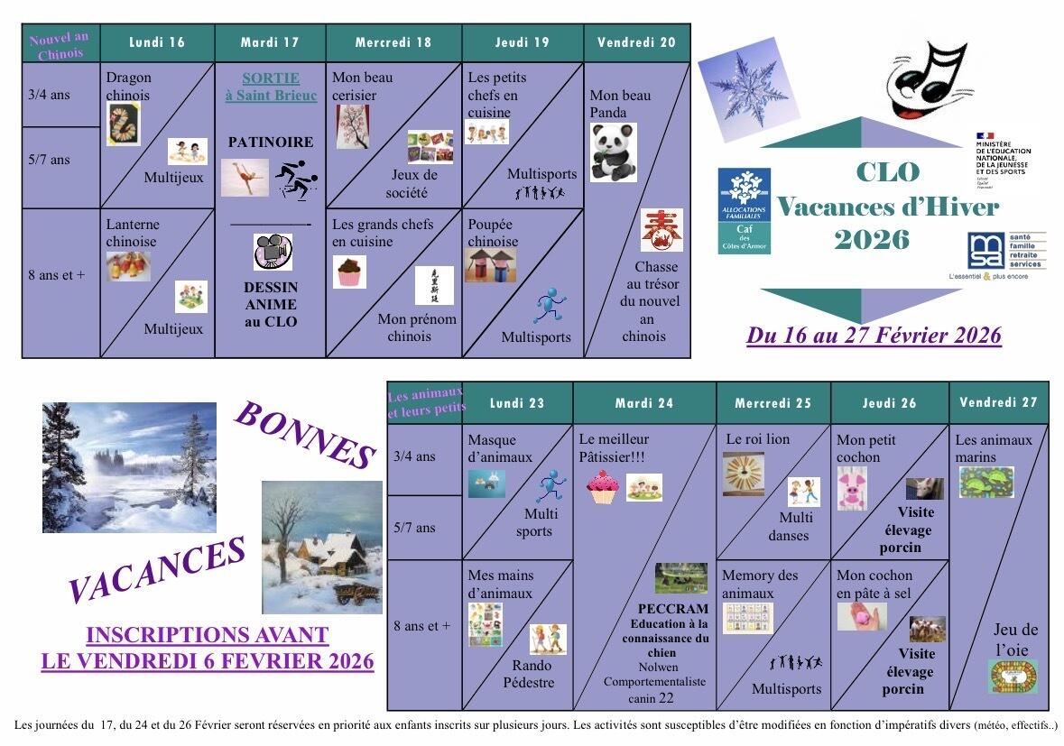Veuillez trouver ci-joint le programme du Centre de Loisirs du Sivu d’Uzel pour les vacances de Février 2026
