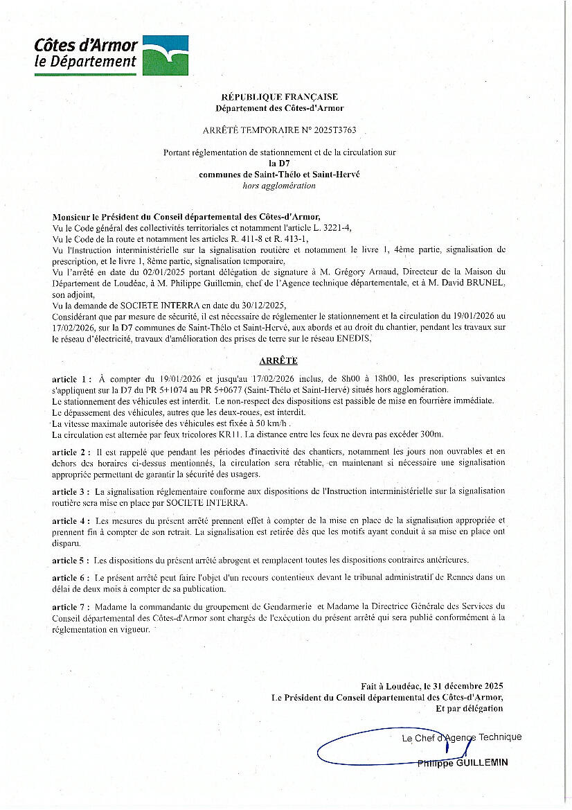 Arrêté Temporaire D7 26/1/26 Veuillez trouver ci-joint l'arrêté départemental pris à partir du 19 janvier pour la D7 Source : Mairie de Saint-Hervé