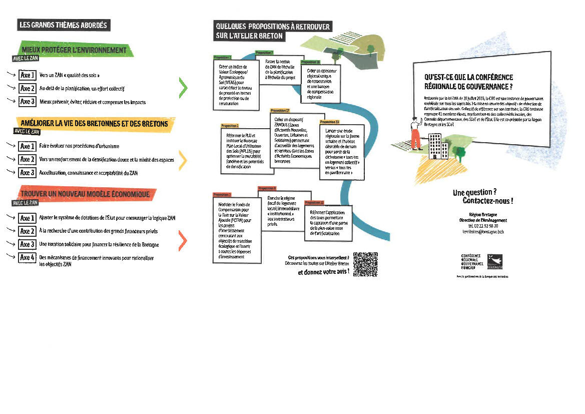 Une consultation a été lancée à l’initiative de la Conférence Régionale de Gouvernance sur la mise en place du ZAN (zéro artificialisation nette) en Bretagne. Cette consultation présente 68 propositions qui pourraient être mise en place pour faciliter un usage plus sobre du foncier et ainsi réduire la consommation d’espace.