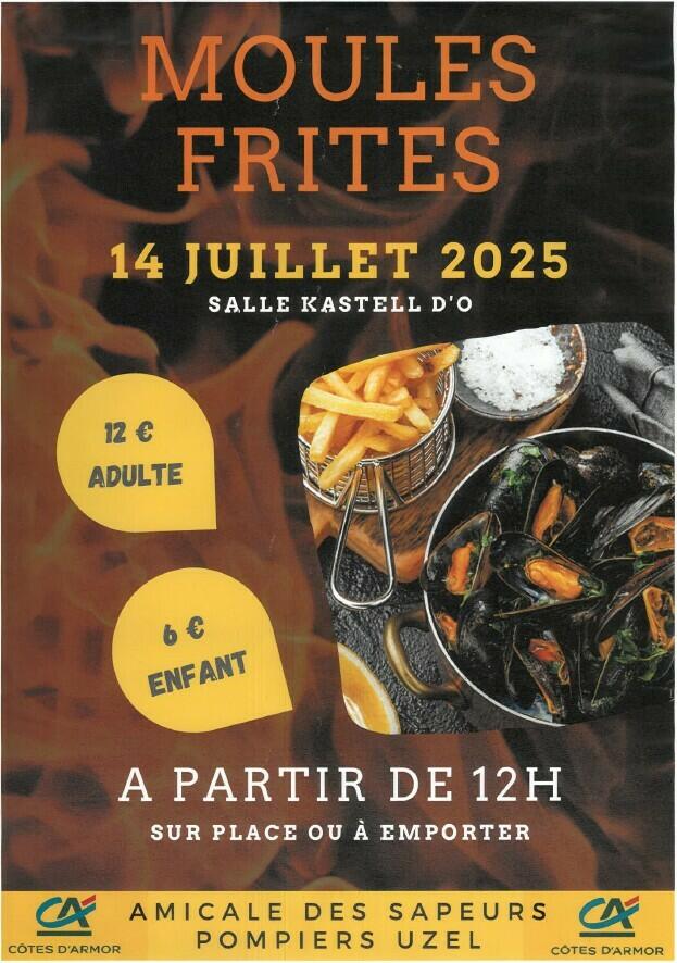 L'Amicale des Sapeurs Pompiers d'Uzel, organise leur traditionnel Moules-Frites le 14 juillet à partir de 12h, à la salle Kastell d'O.