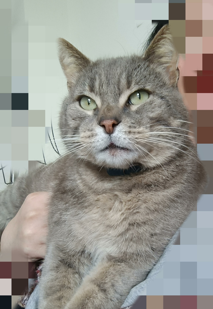 Il s'appelle Callisto. Chat mâle gris beige, pucé, collier bleu-gris. Avec une petite entaille à l' oreille gauche.
