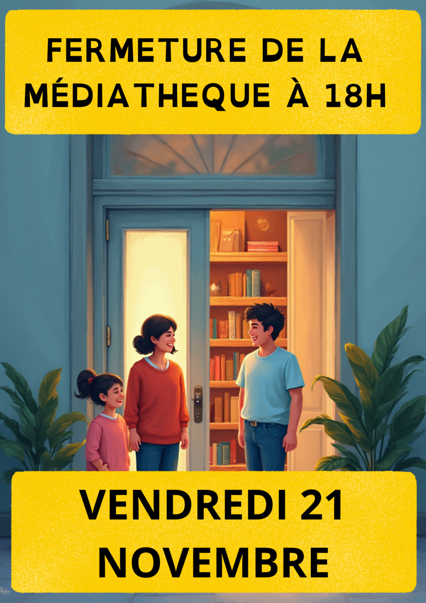 La médiathèque fermera exceptionnellement à 18H le vendredi 21 novembre. Merci de votre compréhension.