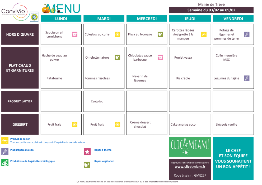 / Menu Cantine Trévé : semaine du 03 au 07 février