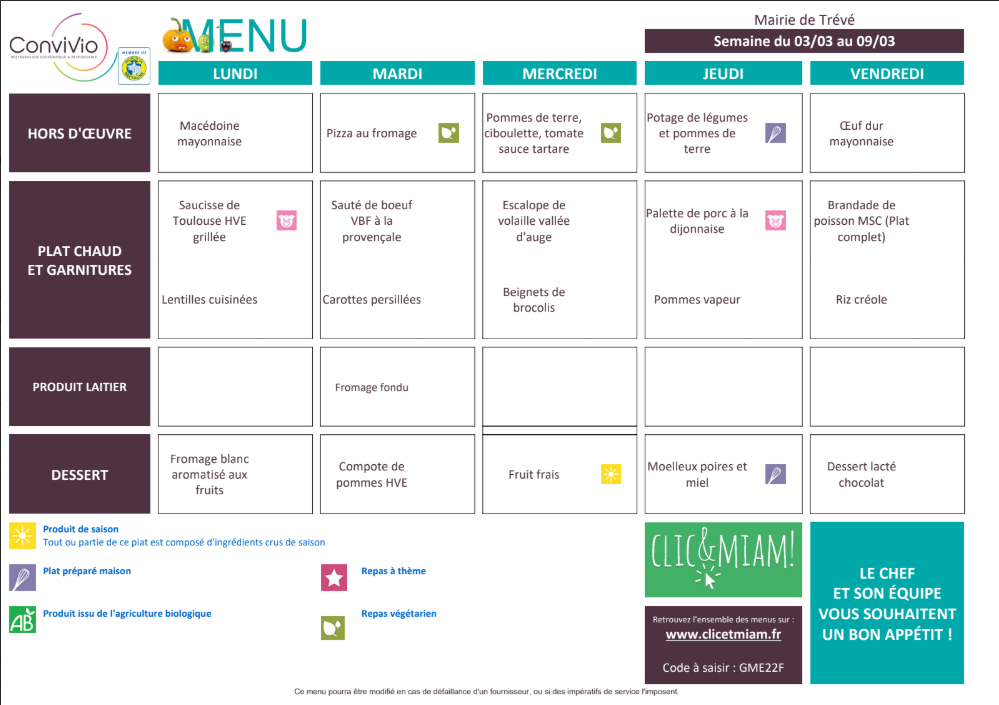 Menu Cantine Trévé : semaine du 03 au 07 mars