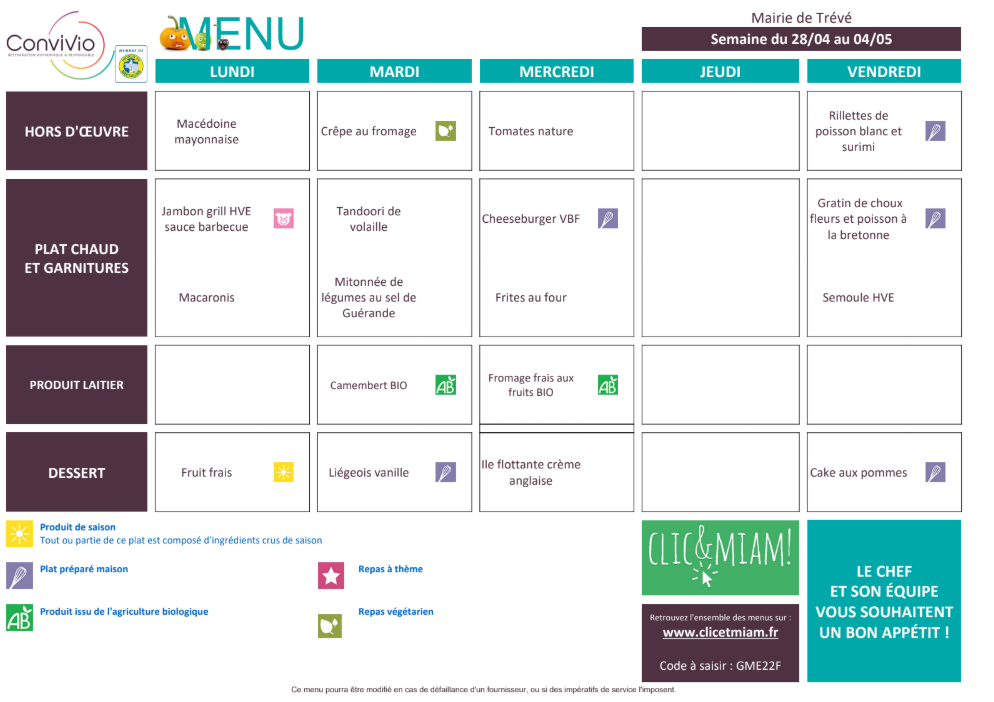 / Menu Cantine Trévé : semaine du 28 avril au 02 mai