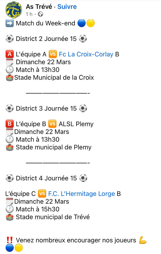Trévé Sports : matchs de ce dimanche