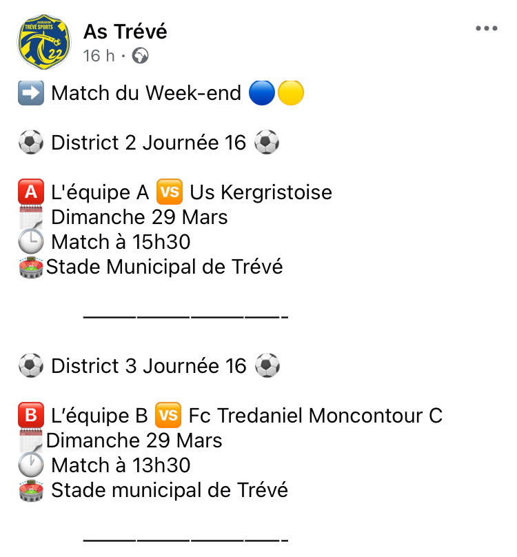 Trévé Sports : matchs de ce dimanche