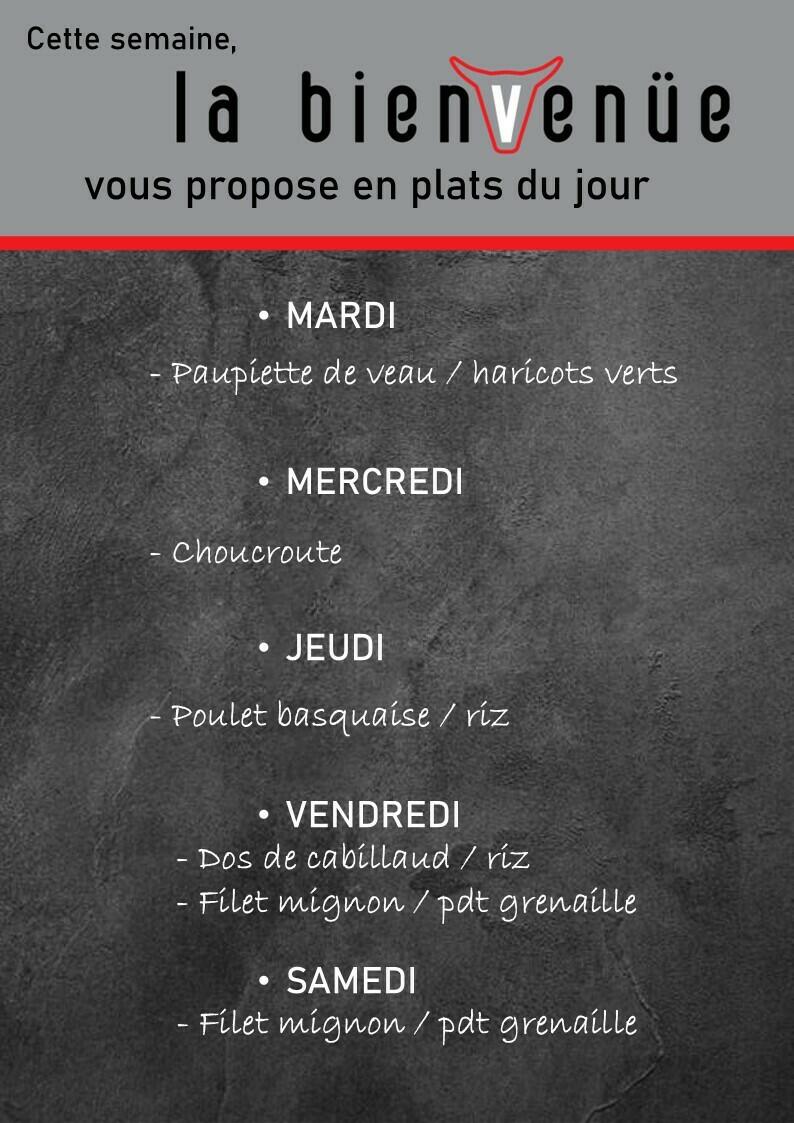 La Bienvenūe 12/2/26 Les plats à emporter de la semaine et les dates de fermeture. Source : Mairie d'Uzel-près-l'Oust