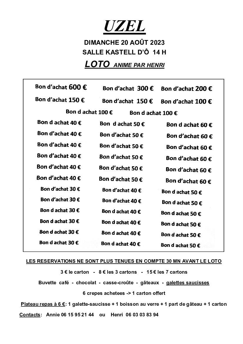 Le Club de l'Amitié Uzel-St Hervé organise un grand loto le dimanche 20 août à 14 h à la salle Kastel d'Ô. Ouverture des portes à partir de 11 h. Premier lot 600 € et nombreux autres lots. Buvette et restauration sur place (galette-saucisse, casse-croûte, plateau repas à 6 €).