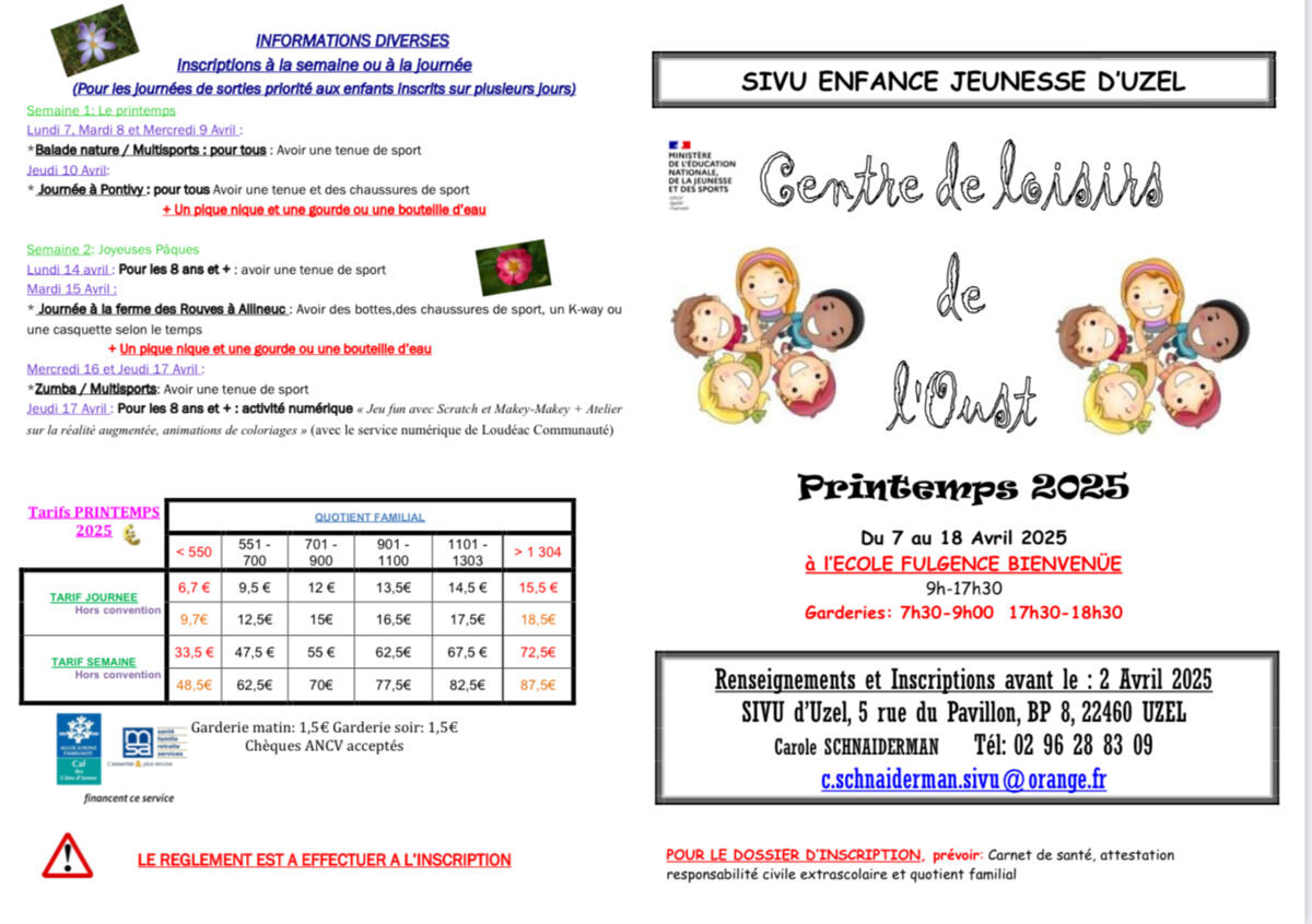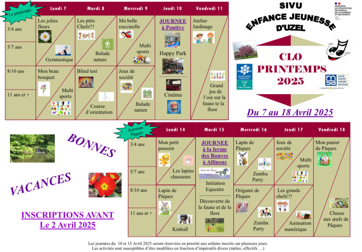 Vous trouverez en pièces jointes le programme du CLO pour les prochaines vacances associé aux modalités d’inscription.
