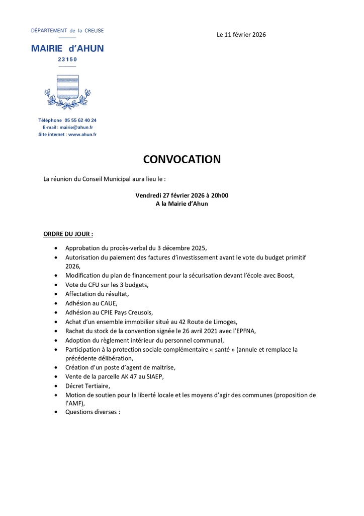 Conseil Municipal du 27 février 2026 à 20h