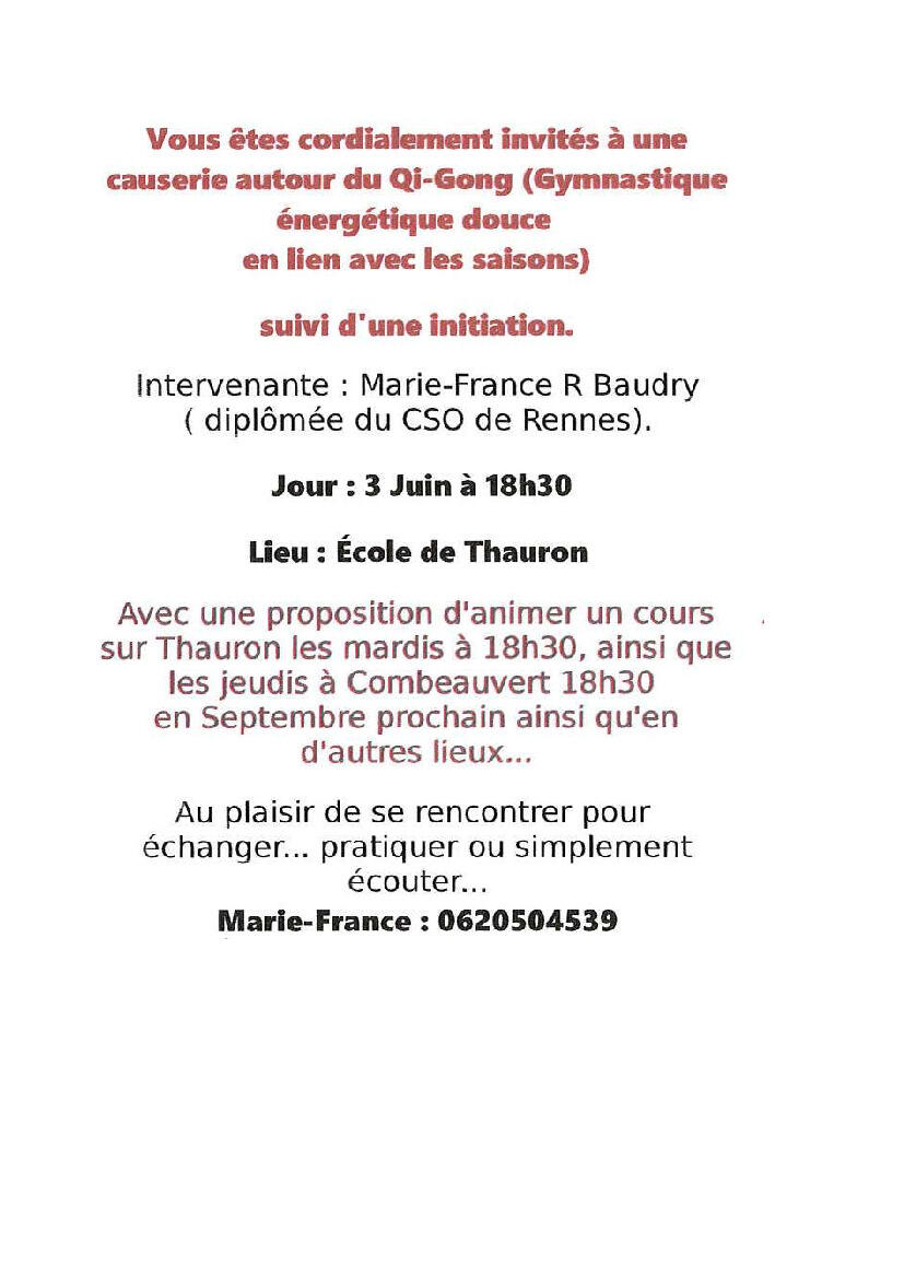Nouvelle activité sur Thauron 13/5/25 Vous êtes invités à une première initiation au Qi-Gong le 3 juin à 18h30 Source : Mairie de Thauron