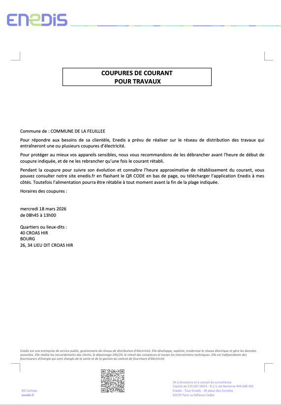 Pendant la coupure pour suivre son évolution et connaître l’heure approximative de rétablissement du courant, vous pouvez consulter notre site enedis.fr en flashant le QR CODE en bas de page, ou télécharger l’application Enedis à mes côtés. Toutefois l’alimentation pourra être rétablie à tout moment avant la fin de la plage indiquée.