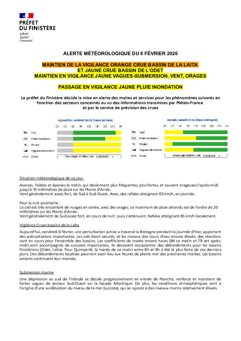 Vigilance météo 6/2/26 Le département du Finistère est placé en VIGILANCE ORANGE CRUE LAITA, JAUNE ORAGES, VENT, PLUIE INONDATIONS et CRUE ODET