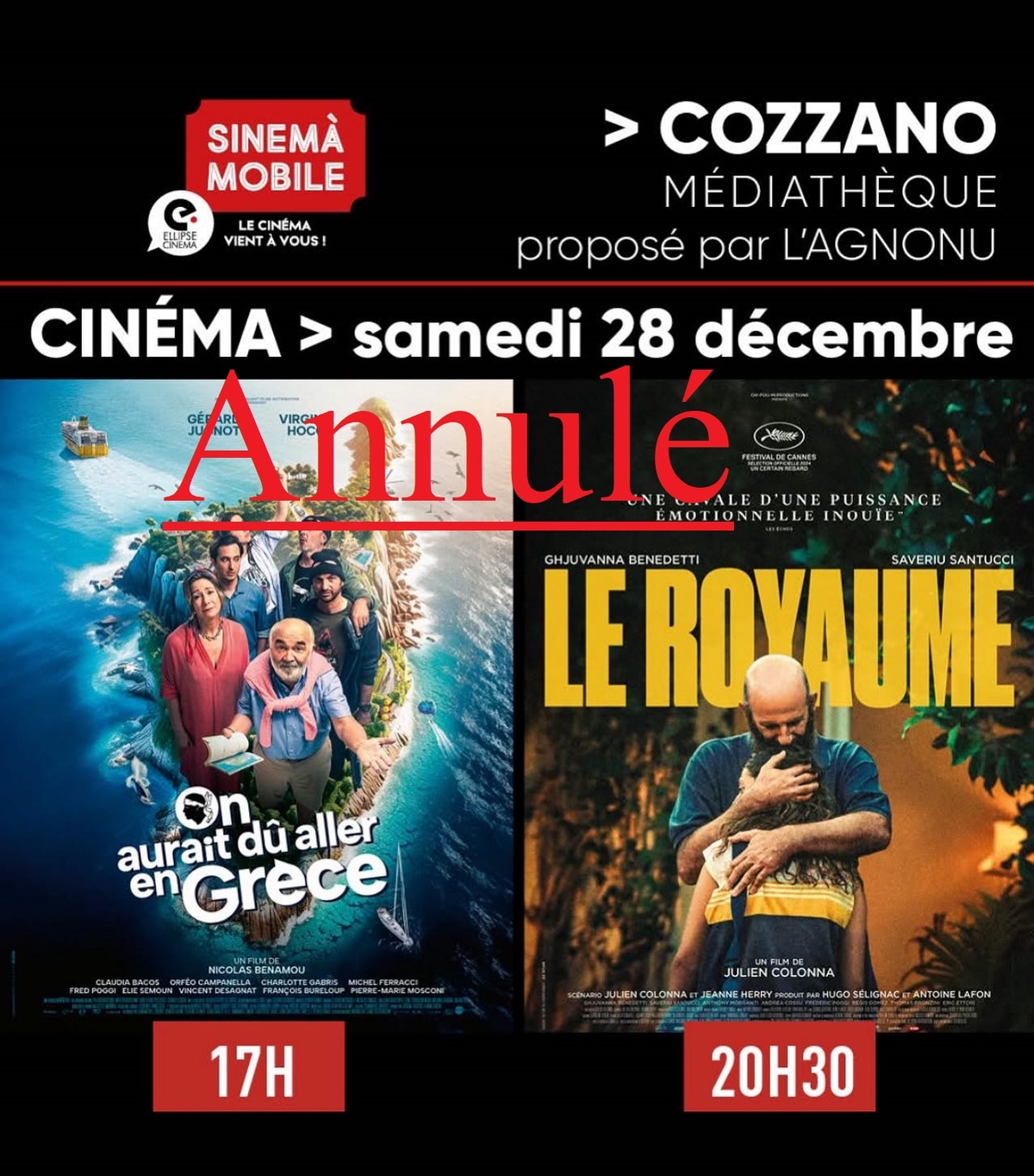 Séances cinéma annulées 28/12/24 Nous vous informons que les deux séances de cinéma de cet après midi sont annulées.