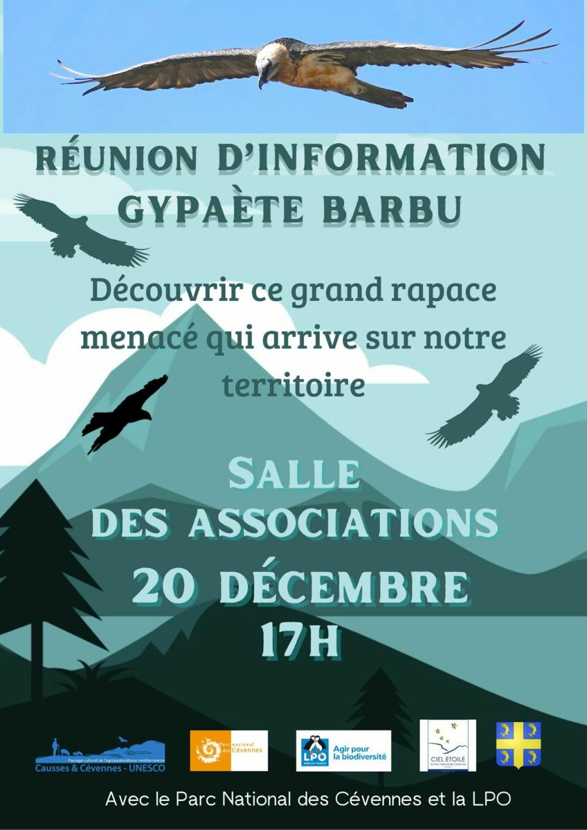 Une réunion d'information sur le gypaète barbu est organisée par le Parc National des Cévennes et la Ligue pour la Protection des Oiseaux le samedi 20 décembre à 17h à la salle des associations.