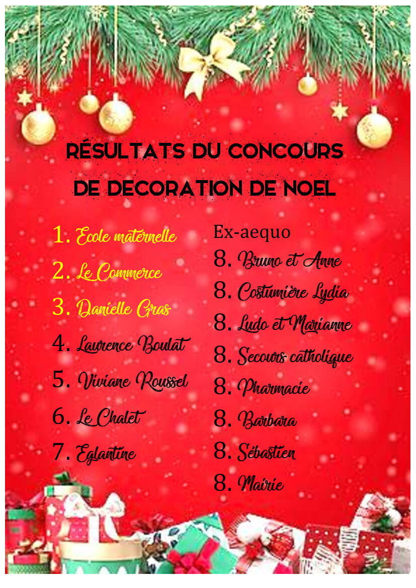 Voici les résultats du concours de décoration de Noël. Le dépouillement a eu lieu hier soir à la salle polyvalente lors de la clôture des Génio lutins.