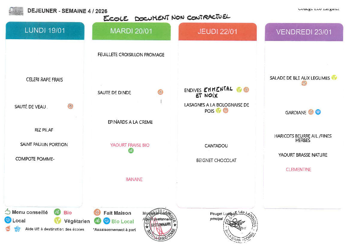 Menu de mi-janvier à la cantine