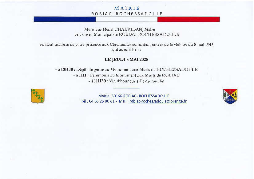Veuillez trouver ci jointe l'invitation pour les cérémonies commémoratives de la victoire du 8 mai 1945.