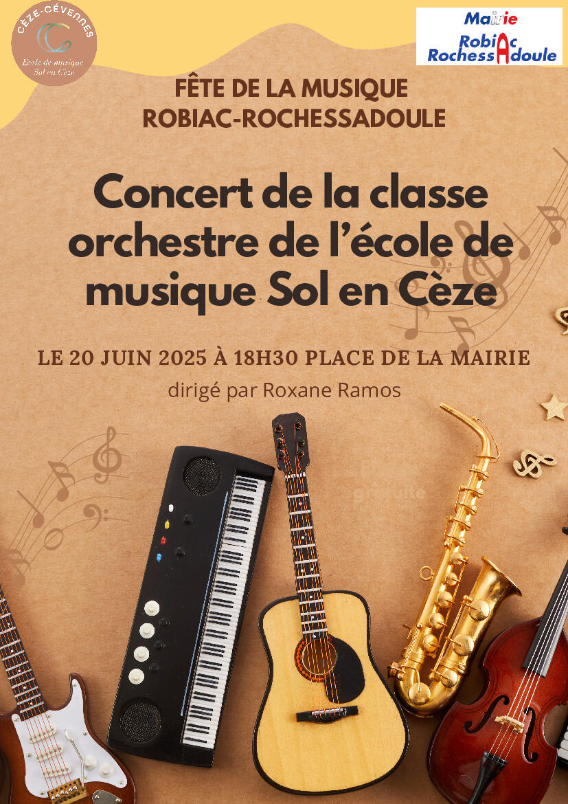 Concert de la classe orchestre de l'école de musique Sol en Cèze le vendredi 20 juin 2025 à 18H30 place de la mairie à Rochessadoule. Au programme: Sera perche ti amo, satistaction, The final countdown ... 🤩