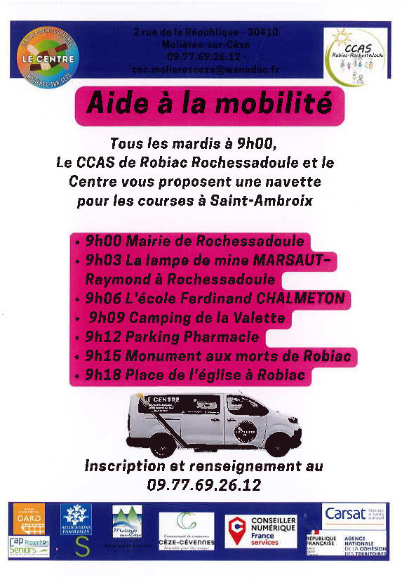 Tous les mardis à 9h le CCAS de Robiac-Rochessadoule et le Centre socio-culturel de Molières-sur-Cèze vous propose une navette pour faire vos courses à Saint-Ambroix.