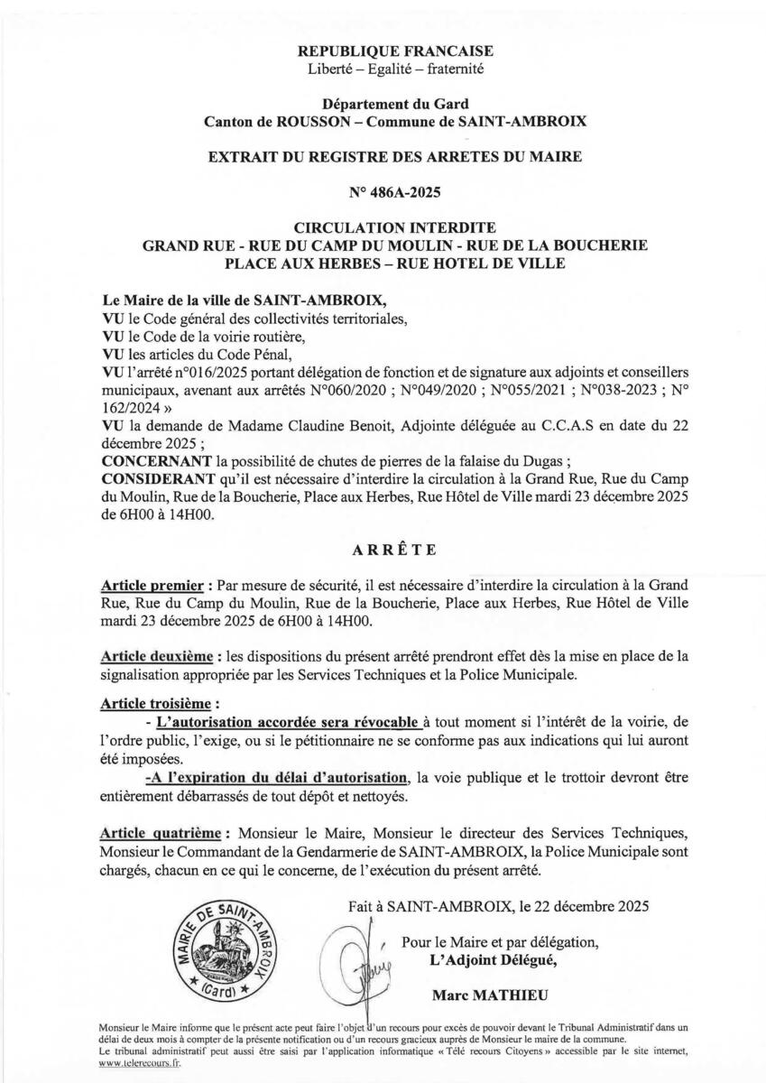 ARRÊTÉ MUNICIPAL CIRCULATION - MARDI 23/12/2025 de 6H à 14H
