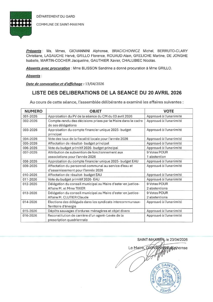 Liste des délibérations du Conseil Municipal du 20 avril 2026