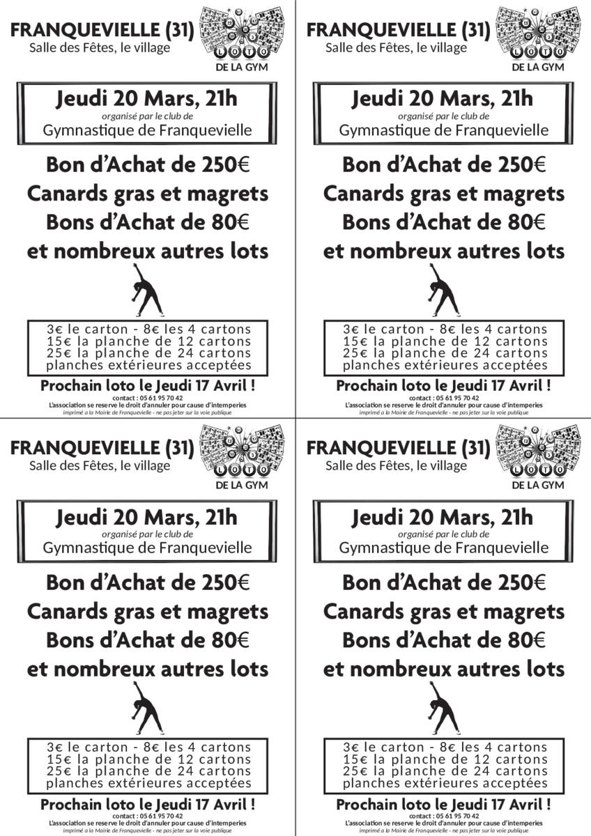 Ne manquez pas le LOTO organisé par la  Gym de Franquevielle ce jeudi 20 mars 2025 à 21 h  dans la salle des fêtes de Franquevielle !